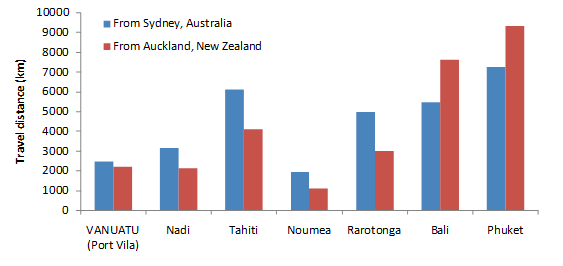 The effect on agricultureWith a majority of the country's population living directly off their land, the most crucial question surrounding climate change in Vanuatu is its effect on agriculture. There are concerns that climate change could reduce agricultural yields through heat stress, changes in rainfall and greater pest activity (FAO 2008). Seasonal weather patterns may become more extreme, with lack of water at drier times of year causing stress to crops while intensified rainfall during storms causes waterlogging and soil erosion (IPCC 2008, NACCC 2008). Evidence from elsewhere in the world suggests that yields of coconuts, Vanuatu's most important export crop, increase with rainfall, and would thus be harmed by drier conditions (Fernando et al 2007). Crop yields may benefit from higher levels of atmospheric CO2, but global studies suggest that in general this effect will not be sufficient to offset the decrease in yields brought about by climatic stress (Long et al 2006). However, there has been a lack of specific research into how Vanuatu's main crops - particularly tuberous staples such as yam and taro (Miglietta et al 2000) - respond to alterations in climate and CO2 levels. At present Vanuatu's agricultural potential is under-utilised, with productivity low and only a third of cultivable land in use (ADB 2007, NACCC 2008). It might therefore be hoped that the introduction of more modern farming methods and the bringing of additional land under cultivation could offset any decrease in yields brought about by climate change. However, intensification and modernisation of agriculture brings risks of its own, exacerbating environmental problems such as soil degradation and deforestation, and undermining traditional methods of coping with natural hazards such as the preserving of fruit and maintaining of plots of cyclone-resistant root vegetables alongside other crops (Welegtabit 2007). Rapid population growth is another concern (FAO 2008), and could negate any enhancement of food security brought about by improvements in agriculture. The effect on fisheriesFishing is important to the nutrition and self-reliance of many rural islanders (FAO 2008), with a subsistence fishery harvest estimated at 2,400 tonnes in 2000. In addition, foreign fishing vessels operating under license in Vanuatu's 680 000 km² exclusive economic zone caught $9.23 million worth of tuna in 2005, although Vanuatu currently receives only a very small share of this value (ADB 2007). The effects of climate change on ocean circulation patterns and coastal ecosystems are likely to have an impact on fishery harvests. Catches of tuna are expected to increase in the western Pacific and decrease further east as a result of climate change, benefiting Vanuatu at the expense of other countries (World Bank 2000). However, climate change may have a negative effect on small-scale coastal fisheries through degradation of reef and mangrove ecosystems (Nurse & Sem 2001). There is also evidence that warmer water temperatures increase the risk of ciguatera poisoning (Hales et al 2001), which is a major health hazard for those consuming reef fish in Vanuatu. The effect on tourismClimate change has potential consequences for tourism, which is Vanuatu's most valuable export industry (ADB 2009). Over 75% of visitors to Vanuatu originate from Australia and New Zealand (VNSO n.d.), and warmer winters in countries such as these, together with perceptions of increased risk from tropical diseases and natural disasters, may deter tourists from visiting the country (Barnett 2008). Intensified storms and rising sea levels could also inflict costly damage upon coastal tourist infrastructure (WTO 2007). The desire to curb greenhouse gas emissions will create pressure in developed countries to reduce long-distance air travel, perhaps through greater taxation (Nurse & Sem 2001, WTO 2007). This could harm Vanuatu's tourist industry: data from Australia show that tourists will substitute domestic for foreign holidays if the price of international travel is increased (Hamal 1996). However, efforts to reduce the distance flown by tourists could also benefit Vanuatu, which is closer to Australia and New Zealand than many comparable destinations (Figure 2).