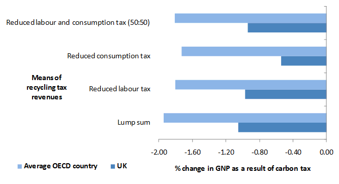 Would the replacement of income tax with an energy tax be socially justifiable?It has now become clear that the greenhouse gas emissions resulting from energy use are inflicting costly damage upon the global environment (Stern 2006). Taxation of energy provides a possible means of internalising this cost, reducing energy demand and the resulting environmental burden. Ideally, this tax would be based on carbon emissions rather than on energy per se, encouraging a long-term shift towards lower-carbon energy sources (RCEP 2000), although the short-term economic impacts are likely to be similar in either case (Symons et al 2000). The analysis below draws upon both the energy-tax and the carbon-tax literature, focusing on the present situation in the UK but incorporating evidence from other developed countries. It has been widely speculated that if the revenue from an energy tax were used to finance the reduction of taxes that currently distort the economy, the change would enhance welfare by means other than simply protecting the environment, an idea known as the 'double dividend hypothesis'. In particular, the use of energy tax revenues to reduce income tax would be expected to improve labour market efficiency, thereby boosting employment. Goulder (1995) distinguished a 'strong' form of the double dividend hypothesis, which asserts that such a tax change would be worthwhile regardless of environmental considerations, and a 'weak' form, which asserts merely that the use of environmental tax revenues to reduce income tax is beneficial when compared with a scenario in which revenues from the tax are recycled in a lump sum fashion. Many studies have investigated the extent to which the double dividend would actually be realised in different scenarios, and thus the extent to which replacement of income tax with energy taxation might enhance social welfare. Their conclusions are summarised below. The first dividend: environmental benefitsThe most obvious social argument for an energy tax is to ensure that consumers of energy bear the full cost of their actions. The idea of using taxation to correct for an externality such as pollution dates back to Pigou (1932), who proposed that taxes on socially-damaging activities should be set at a level which reflects their marginal social cost. Based on Stern's (2006) estimate that the social cost of CO2 emissions is $85 (approximately £52) per tonne, a 'Pigovian' tax on energy in the UK would have been expected to raise £28.4 billion in 2007, the most recent year for which precise data are available (Jackson et al 2009). The actual revenue in that year from what the British government defines as energy-related 'environmental taxes', primarily fuel duty, totalled £28.2 billion (ONS 2009), a remarkably similar figure. Although this analysis can be criticised on the grounds that estimates of emissions costs are highly uncertain (Tol 2005) and do not take into account other negative externalities such as sulphur dioxide emissions (e.g. Ekins 1996), and that present taxes do not effectively target the most carbon-intensive energy sources (Newbery 2005), it suggests that overall energy taxation in the UK is already at approximately the right level to correct for the negative externality arising from greenhouse gas emissions. Whilst somewhat higher energy taxes might be advocated on precautionary grounds, the cost of £1,096 per ton of CO2 that would be implied if UK income taxes were replaced in their entirety by a tax aimed at reducing greenhouse gas emissions (HMRC 2009) is almost certainly far too large. Evidence from countries that have implemented carbon/energy taxes suggests that they do reduce energy consumption to some extent (Bosquet 2000). However, in many areas of energy use, such as motoring in the UK (Leicester 2005), price elasticity of demand is low and the decrease in consumption achieved is therefore very small. In these cases the main effect of the tax is not to prevent energy users from damaging the environment but to compensate the rest of society for the damage that they cause. The second dividend: broader economic benefitIt is generally accepted that income taxes increase unemployment by distorting the market for labour (e.g. Koskela & Schöb 1999). A shift from income tax to energy taxation would therefore be expected to improve welfare by increasing employment. Numerous models have sought to test this hypothesis, and whilst many have supported it, others have highlighted circumstances in which the expected benefit does not materialise. Some, beginning with Bovenberg & De Mooij (1994), have suggested that replacing income tax with an energy tax would actually decrease employment, since the rise in the cost of goods resulting from the energy tax would reduce real wages and thus the incentive to work. A survey by Bosquet (2000) of different models found that 73% predict a gain in employment if labour taxes are replaced with environmental ones (of which energy tax is a typical example), but that this gain relies on labour markets being flexible enough to allow a fall in real wages. If wages rise in line with prices, an energy tax will simply translate into inflation. To ascertain the effect of tax changes on welfare, we need to consider their impact not only on employment but also on overall economic activity. Just over half of the models surveyed by Bosquet (2000) predict that environmental tax reform would reduce GDP, although in the majority of cases the change is not large in either direction (less than ±0.5%). Babiker et al (2003) modelled the economic effect in various developed countries, including the UK, of different environmental tax reforms aimed at achieving Kyoto Protocol targets on greenhouse gas emissions. In all cases, the tax reforms reduce GNP, but the effect is slightly less severe when the revenues from the environmental tax are used to reduce income taxes compared with lump sum recycling (Figure 1). In other words, a 