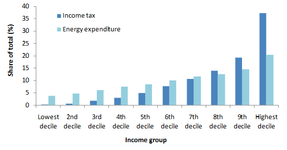 In country with an open economy such as the UK, it might be expected that the taxation of energy (a mobile factor) rather than labour would reduce national welfare by driving investment abroad. However, Koskela et al (2001) argue that replacement of income tax with energy tax can enhance national welfare, by encouraging the replacement of energy with labour as a factor of production. Since labour, unlike energy, is priced above its opportunity cost, benefit is obtained from this substitution. Another concern about energy taxation is that it would be regressive, hitting poorer members of society disproportionately hard, with negative consequences for social welfare. As Figure 2 illustrates, replacing current UK income taxes with a tax levied in proportion to energy expenditure (assuming no shift in consumption) would increase almost tenfold the share paid by households in the poorest decile, while substantially reducing the tax burden of the rich. Furthermore, whilst rich households may be able to decrease their exposure to the energy tax by substituting away from high energy consumption (for example, by investing in home insulation), poorer households typically have fewer such options (Johnstone & Alavalapati 1998). Symons et al (1994) estimate that a simple carbon tax sufficient to reduce UK emissions by 20% would increase the Gini coefficient (a measure of inequality) from 0.386 to 0.397, although they do not consider a scenario in which the revenues are used to reduce income tax. Their model demonstrates that it is possible to design an energy tax that is not regressive if part of the revenue is used to increase benefits for the poorest households, but this diminishes the tax's effectiveness as an environmental measure.