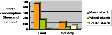 All of this starch is derived from the grains and tubers of plants; in the UK, the main sources are maize, wheat and potato. Genetic manipulation of these plants has the potential to revolutionise the production of starch, increasing the yield of food crops, or allowing the manufacture of starches whose physical and chemical properties are tailored to meet specific industrial needs. In this essay, I will examine the progress that science has made towards understanding the biochemical processes by which plants synthesise starch, and manipulating these processes for the benefit of mankind. The structure and synthesis of starchStarch, a complex carbohydrate, is a polymer of glucose molecules. It occurs in two main forms: amylose, consisting of predominantly linear chains of glucose monomers linked by 1,4-glycosidic bonds, and amylopectin, in which the chains are branched by the addition of 1,6-glycosidic bonds. Amylose comprises between 11 and 37% of the starch found in plants (depending upon the species and the site of storage); the rest is amylopectin.The synthesis of starch in plant cells begins with the enzyme ADP-glucose pyrophosphorylase (AGPase), which catalyses the reaction of glucose-1-phosphate with ATP to form ADP-glucose (liberating pyrophosphate). The ADP-glucose is then used a substrate by starch synthase enzymes, which add glucose units to the end of a growing polymer chain to build up a starch molecule (releasing the ADP in the process). Branches in the chain are introduced by starch branching enzymes (SBEs), which hydrolyse 1,4-glycosidic bonds, and in their place, create 1,6 bonds with other glucose units. Although the pathway of starch synthesis appears relatively simple, it is complicated by the fact that the enzymes involved come in various different forms, which differ in their behaviour and in the parts of a plant in which they are active. Further complexity is created by the presence of de-branching enzymes (DBEs), which hydrolyse 1,6-glycosidic bonds and break apart branches in the polymer chains. Although these are traditionally regarded as catalysts of starch breakdown, it appears that they also play an important role in starch synthesis. Evidence for this comes from the 'sugary' mutants of maize, rice and sorghum, which are deficient in a particular de-branching enzyme, in which starch granules are degraded as they form and replaced with an alternative polymer, phytoglycogen.